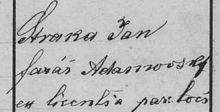 Prosím, nemohu to přečíst celé. Je to zápis o pohřbu, který prováděl jiný farář než příslušný v té obci. Straka Jan, farář Adamovský, ex. licentia paratois? Co to znamená? Bude to mít souvislost s tím, že přijel pohřbít vlastní matku...