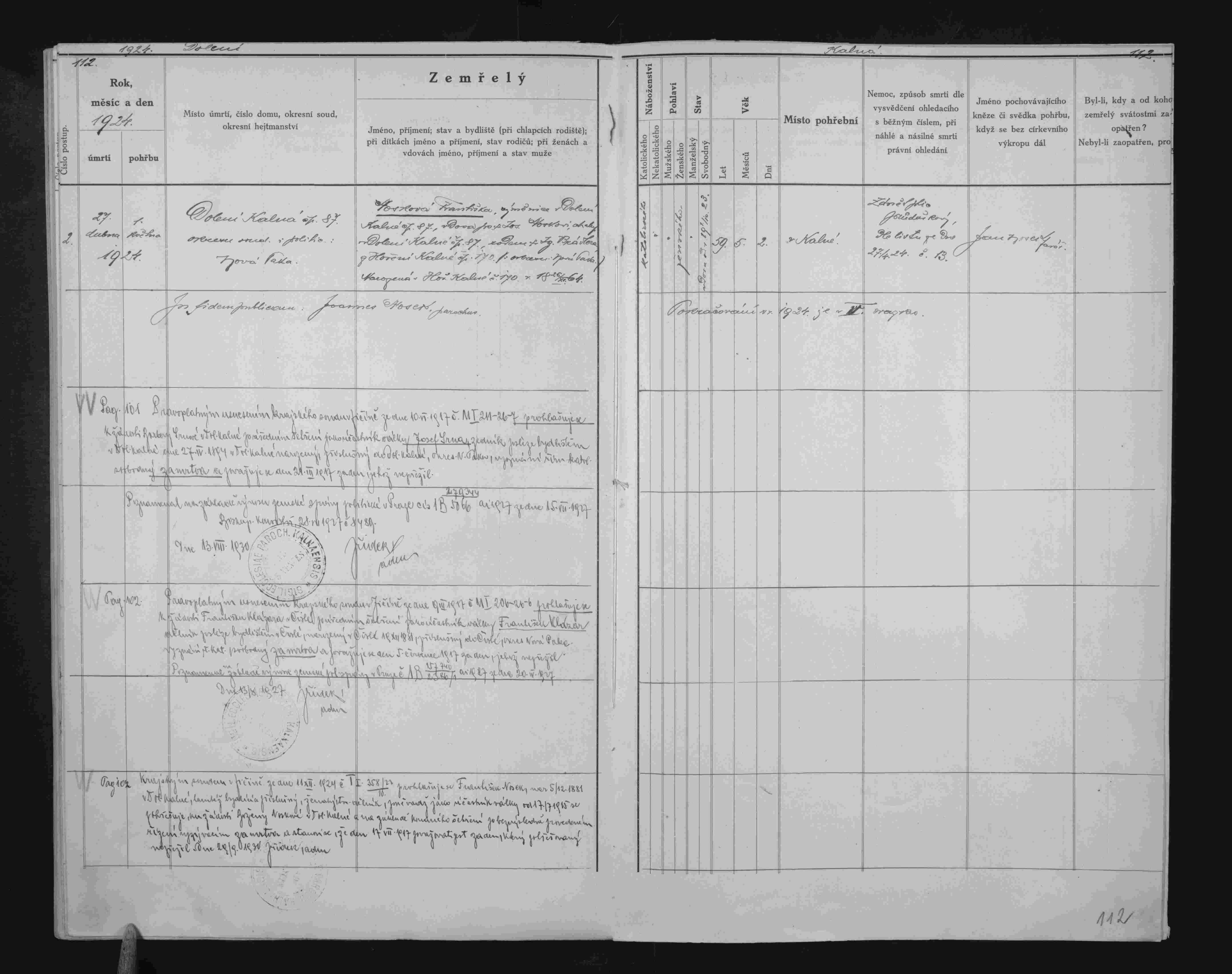 Matrika končí rokem 1924, ale ještě v 1930 tam jsou dopsány úřední prohlášení za "mrtva". Prostřední zápis datovaný k r. 1927.