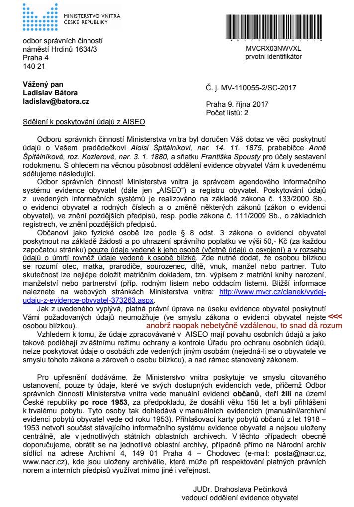 ať se obrátím na Vnitro, že tam mi to za nějakej drobnej poplatek rádi zjistěj. No, a výsledek vidíte tady v příloze.
