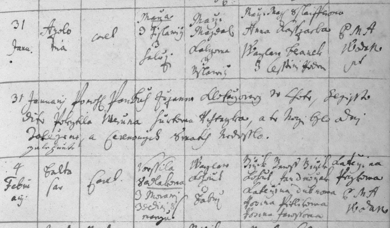31. januaris pomohl PanBůh Zuzanne Klofačovy ve Lhote, jejižto dite pokrztila Weruna hurtova rihtazka(?), a to nez bylo dite zaleženo a ceremonjich swatj nedozslo.
