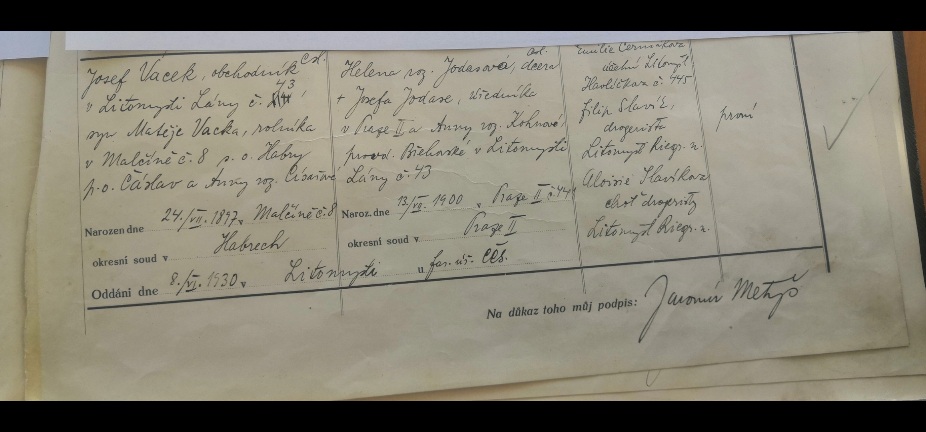 V tom záznamu svatby je napsáno, že svatba proběhla u Československé církve. Předpokládám, že nevěsta nebyla židovského vyznání. Předpokládal bych, že snoubenci k československé církvi přestoupili od jiné křesťanské církve, nejpravděpodobněj od katolické. Hledal bych tedy křest Heleny. Ale kde ho hledat, těžko říct. Může to být kdekoli v Praze, ale i mimo Prahu.