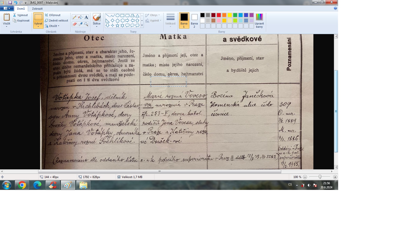 Napadlo mě též, hledat další sňatek, jenže si říkám, že se taky vdát znovu nemusela a jak říkáte, mohla se pak přestěhovat opravdu kamkoli. Zkusím i tak kouknout po druhém sňatku, a dále mě napadlo zkusit prohledat matriky, odkud pocházel její otec (Josef Votápka z Krchleb u Čáslavi) a matka (Marie rozená Vovesová z Prahy V. u té jsem dohledala narození v https://katalog.ahmp.cz/pragapublica/permalink?xid=A3D770897A2D4763871F2A135B0B8CBD&scan=332#scan332