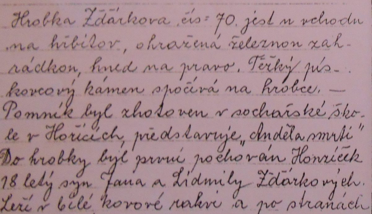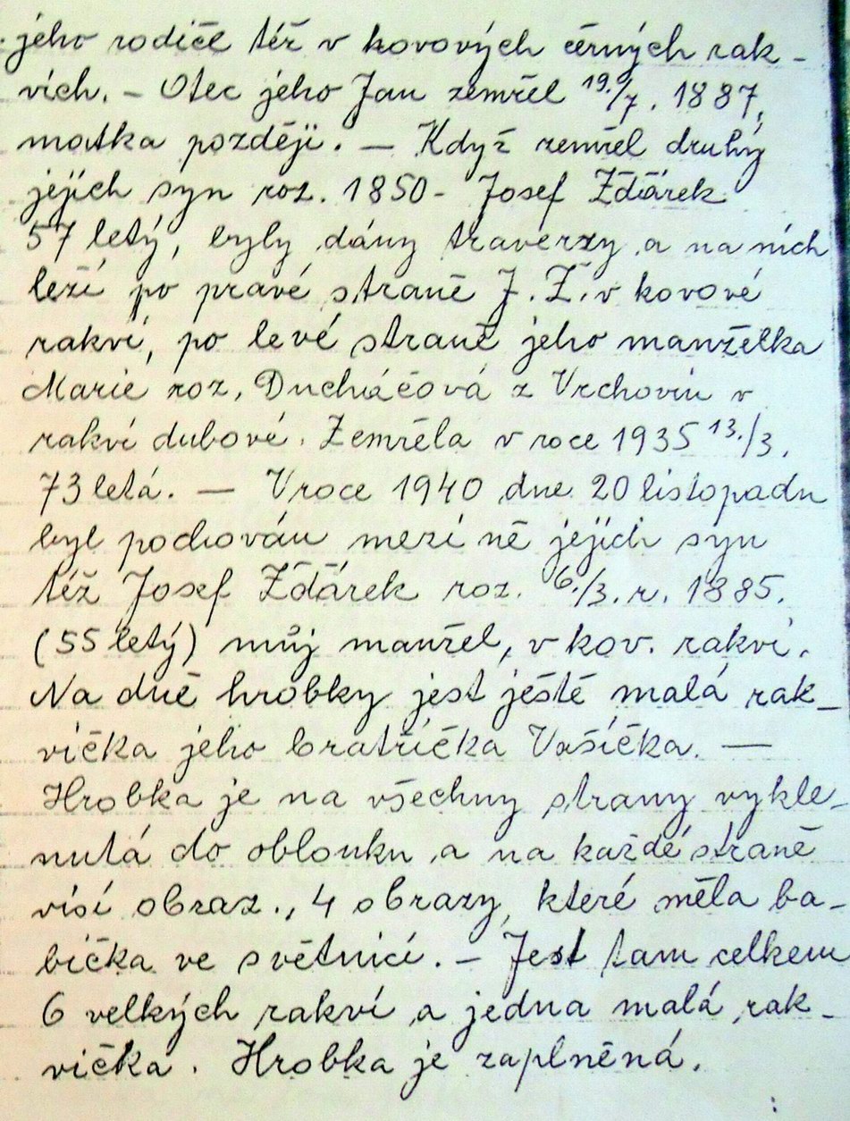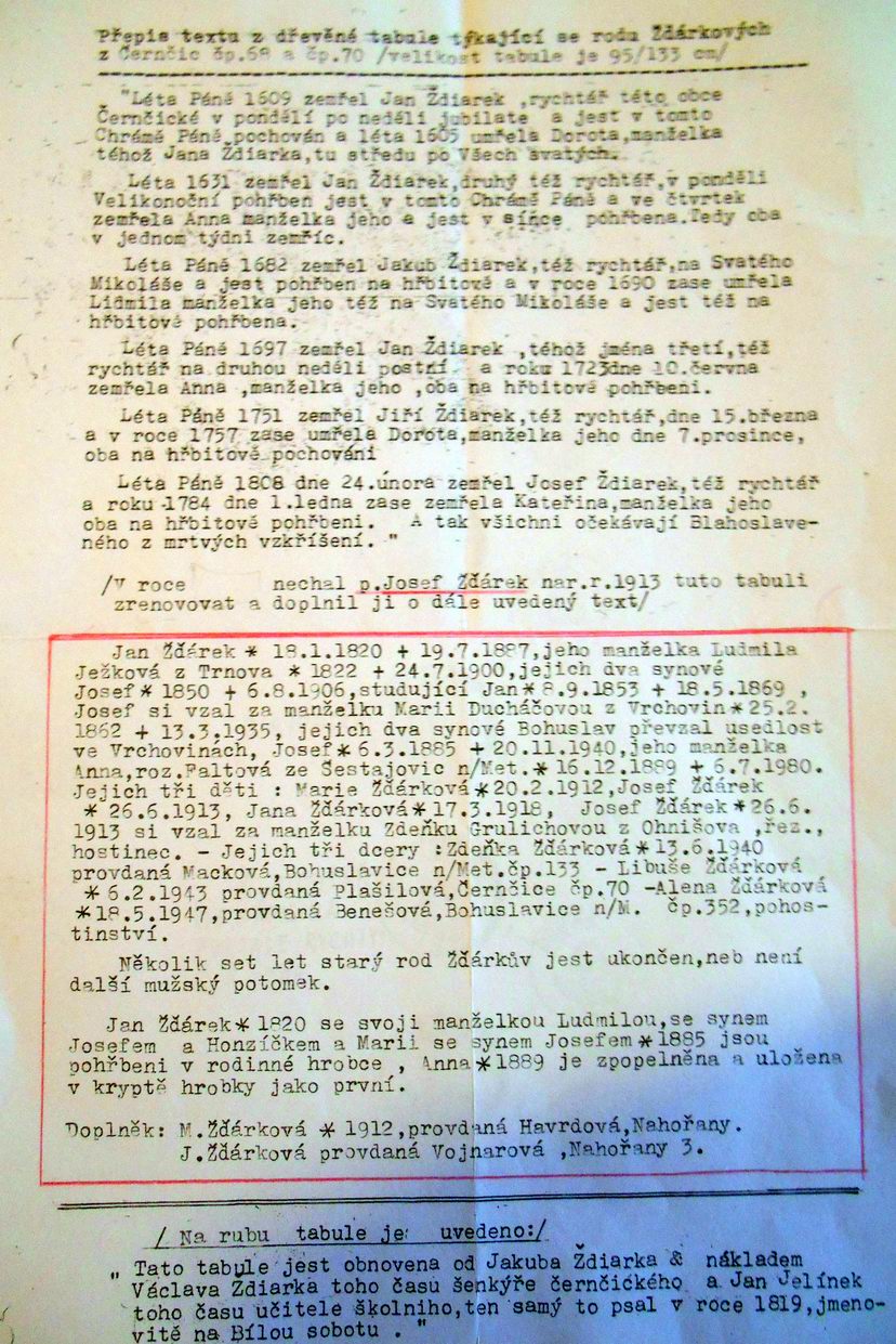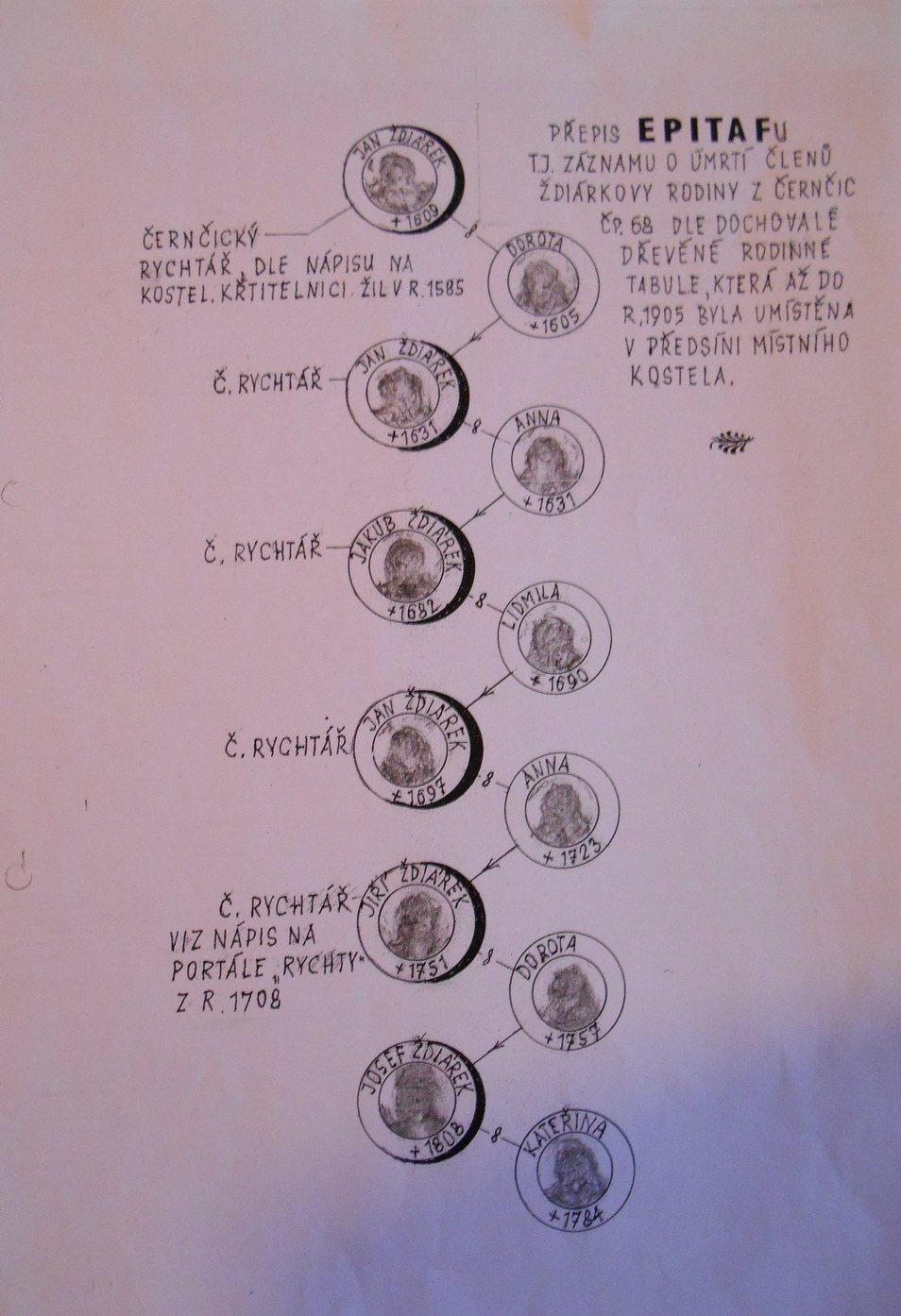 Záznam o úmrtí jednotlivých rychtářů z rodu Žďárků je v majetku Josefa Žďárka z čp. 70 (do nedávné doby ta tabule visela v kostele) uvádí od roku 1609 do 1808 šest rychtářů toho rodu) Dnes máme v obci šest rodin Žďárků (v popisném čísle 16., 35., 36, 54. a 70.) jejich vzájemné příbuzenství se nedá zjistit. (z Beranovi kroniky r. 1924)