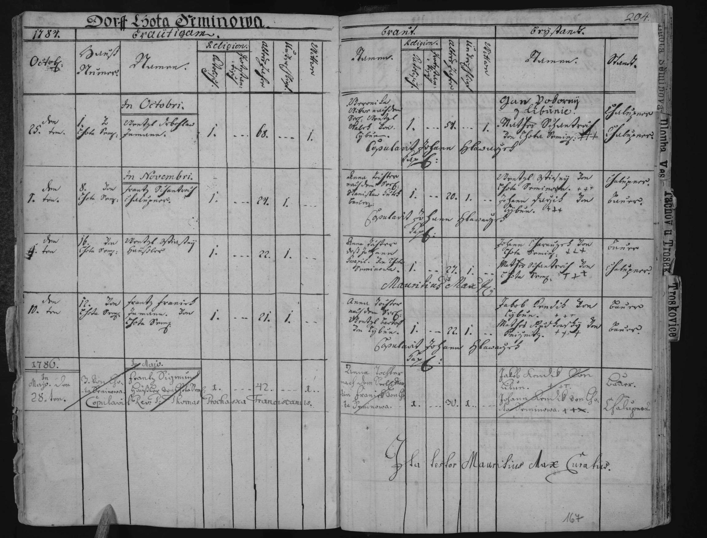 Samozřejmě jsem měl na mysli děd a ne, jak jsem uvedl, otec.Víry byli předci katolické.Pro ilustraci uvádím k porovnání zápisy z matrik narozených.Rozporná jsou jména a příjmení rodičů matky "Doroty Fraňkové"u jednotlivých zápisů: 9.9.1822 narozen Jan Franěk,25.5.1834 narozena dvojčata Josef+Anna Fraňkovi,24.11.1836 narozena Kateřina Fraňková.Uvádím i odkaz na zápis v knize oddaných "Františka Fraňka z Seminovy Lhoty 12 a Anny Bartošovy z Libuně pořízený 10.11.1784