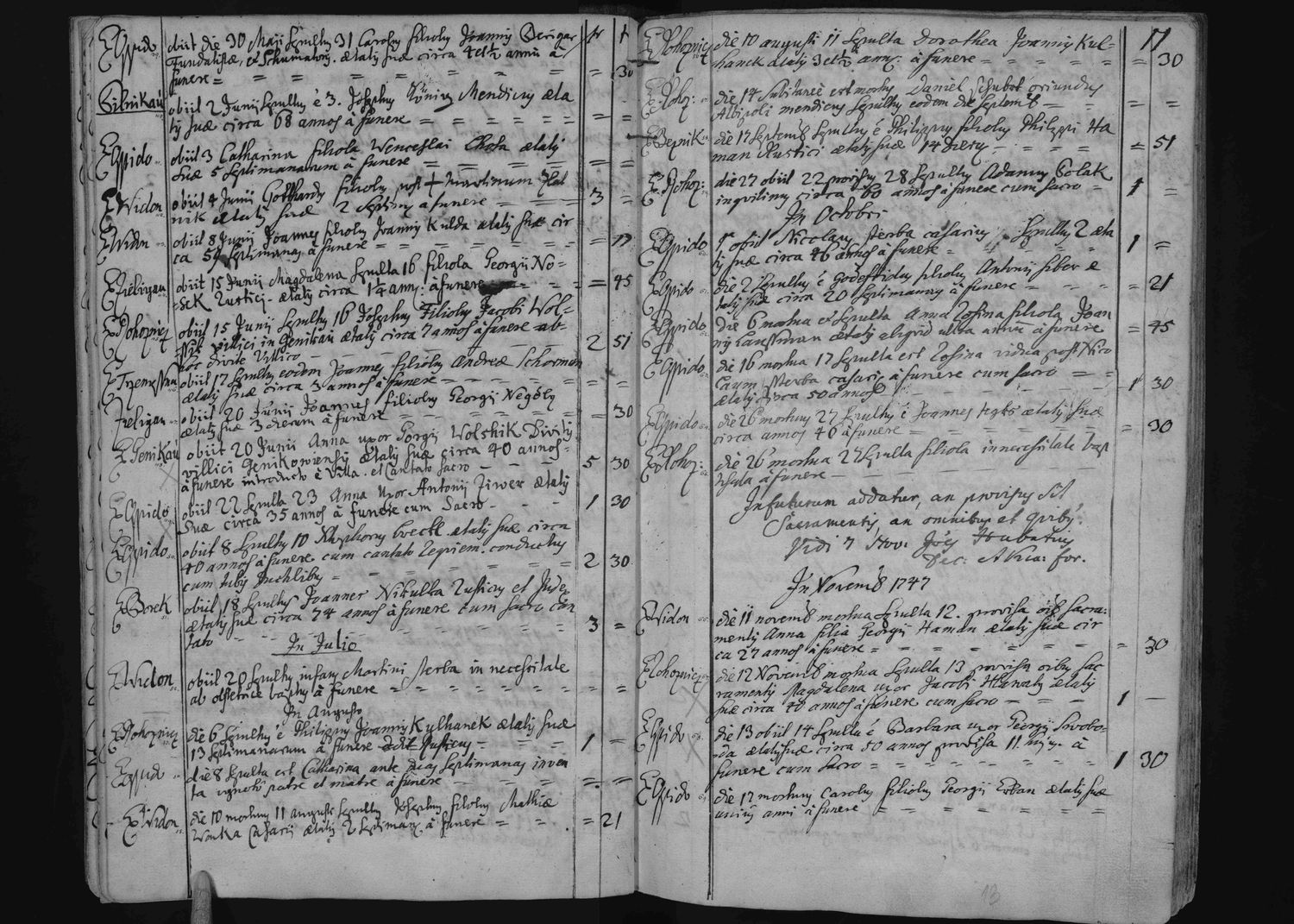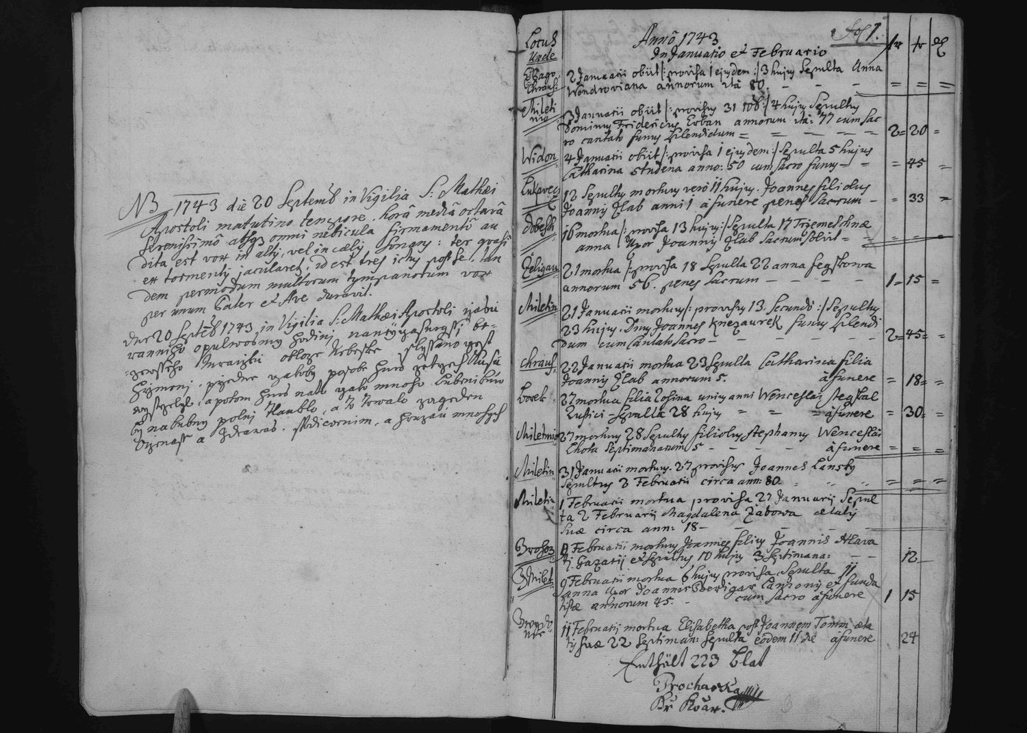 v matrice zemřelých rok 1743 jsem narazil na čísla uvedená ve třech, později ve dvou sloupcích. Poradil by mi někdo co ta uvedená čísla znamenají? Věk ani číslo domu to nebude. Napadá mě odkaz na něco nebo poplatek za pohřeb?