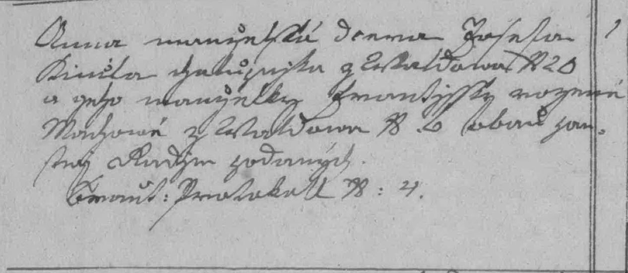 "Anna manželská dcera Josefa Kinčla ?chalupníka? z Waldowa N 20 a jeho manželky Františky rozená ?Mochová? z Waldowa 18. " A dál nevím, poslední slovo následující věty vypadá jako "podaných"