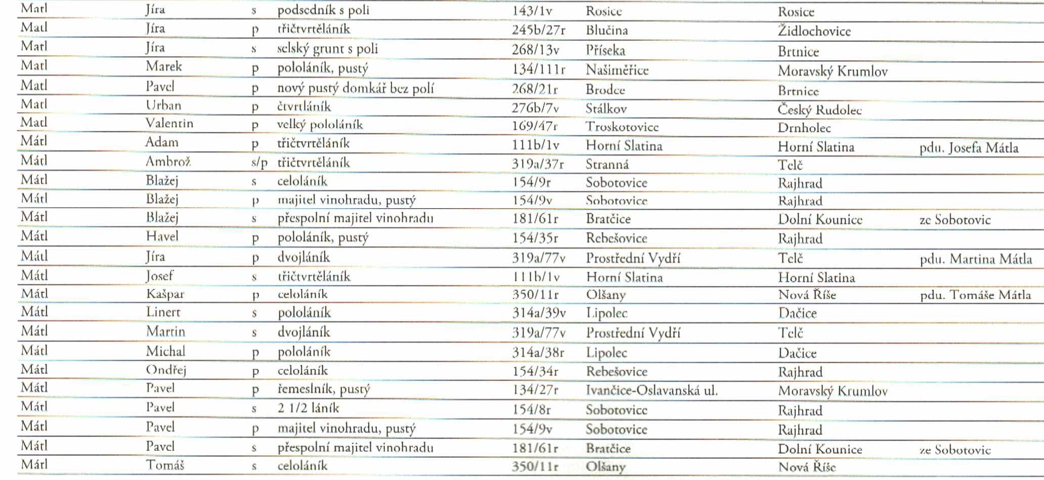 mohla bych poprosit v Generálním rejstšíku k lánové vizitaci o příjmení Mátl, Matl, Mattel, Matel v Rajhradě nebo Rebešovicích. Děkuji