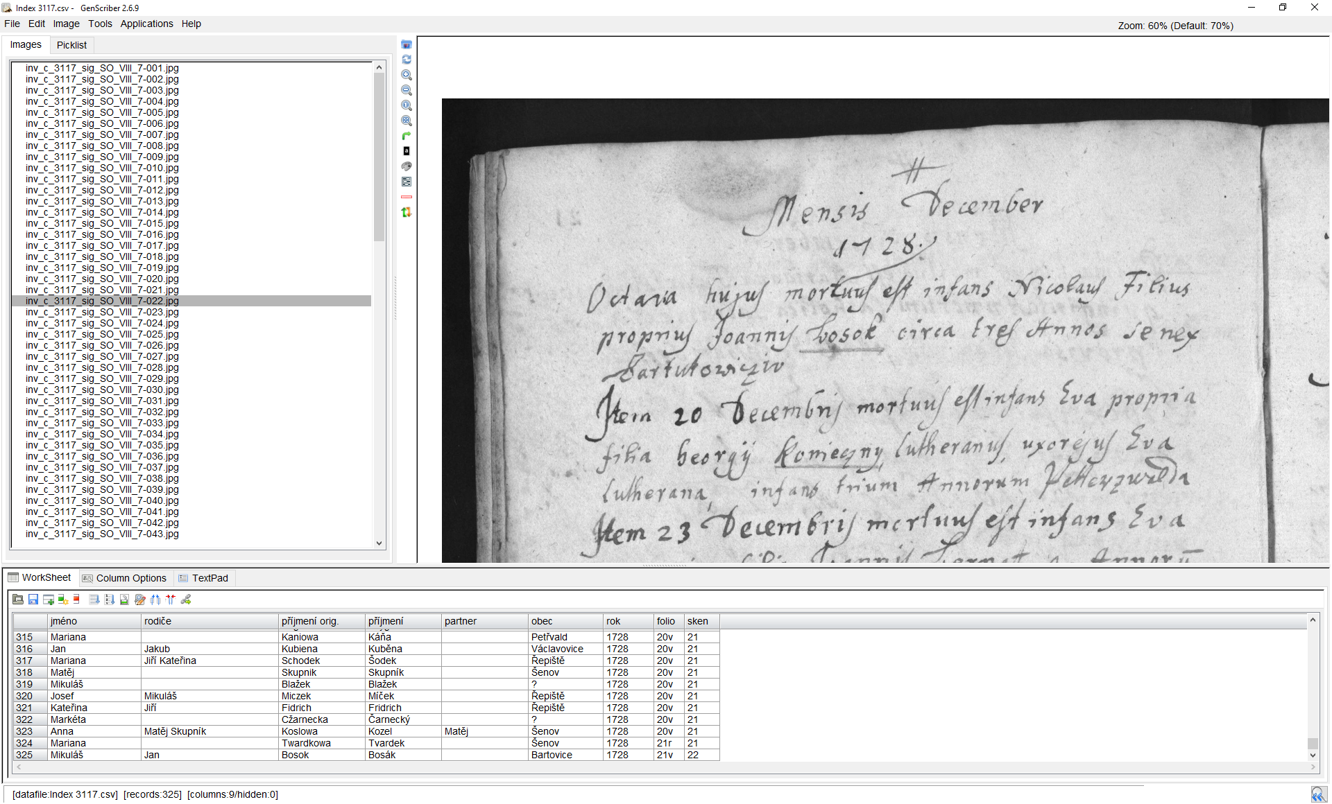 Vlevo nahoře je okno se seznamem snímků, zde se v případě používání zobrazují seznamy položek (záložka Picklist - bude vysvětleno později), vpravo nahoře je aktuálně přepisovaný snímek a dole tabulka, do které přepisujeme data ze snímku. Všimněte si tří záložek nad tímto oknem - WorkSheet, Column Options a TextPad.