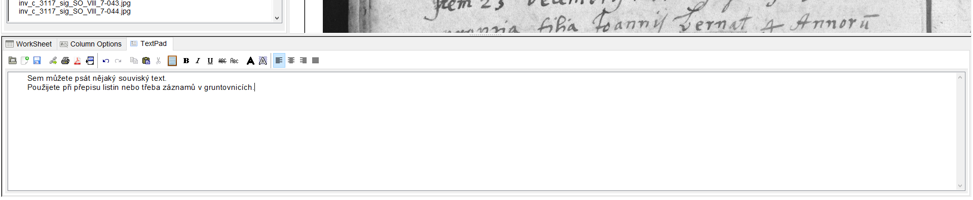 Záložku TextPad využijete při přepisování souvislých textů, např. listin nebo gruntovnic.