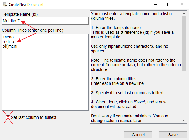 Prvotní vytvoření tabulky je trochu složitější. Program nabízí spoustu předpřipravených šablon (File -> New Document From Template), ale ty jsou připravené pro přepisy čert ví čeho a budeme si muset připravit tabulku podle svých potřeb. A následně si ji můžeme uložit, jako vlastní šablonu. Já si takhle vytvořil šablony pro přepis N, O, Z.