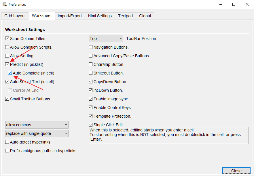 Otevřete z menu Tools -> Preferences a na záložce Worksheet zaškrtněte položky Predict (in picklist) a Auto Complete (in cell):