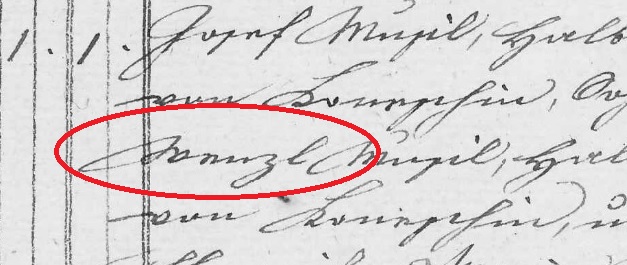 Snažte se tohle, prosím, dodržovat, i když tady je to jméno zrovna nádherně čitelné. Je potřeba si uvědomit, že je záznam napsaný kurentem (zjednodušeně řečeno psací podobou švabachu). Jestli chcete pátrat ve starých rukopisech, kurent se muíte naučit bezpodmínečně číst. Bez něj to vůbec nepůjde. Jestli jste se s kurentem zatím nesetkal, zkuste si vzít třeba tuhle tabulku: https://genealogie.nka.cz/?page_id=177 a luštit s její pomocí.