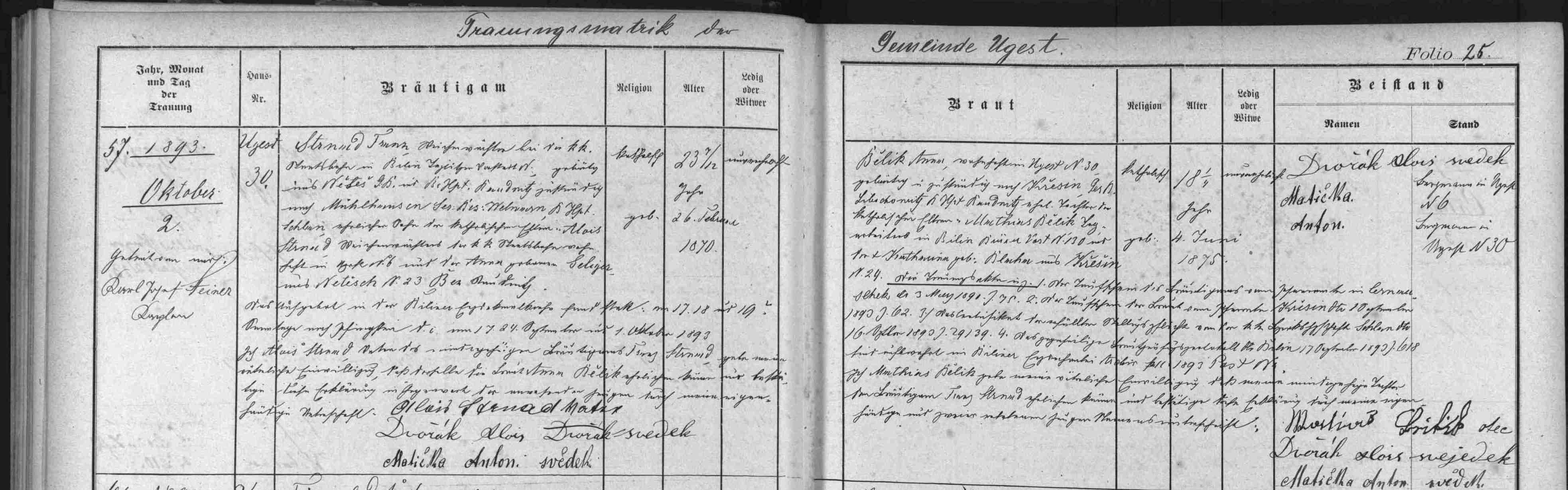 Strnad Franz, Weichenwächter bei die k.k. Staatsbahn in Bilin Teplitzer Vorstadt N. _ gebürtig aus Wěteš? G.B. und B. Hpt. Raudnitz? zuständig nach Mühlhausen Ger. Bez. WelwarnB. Hpt Schlan, ehelicher Sohn der katholischen Ehlma. Alois Strnad Weichenwächtlersder k.k. Staatsbahn wohnhaft in ??? N. 6 und der Anna gebornen Seliger aus Netisch N. 23 Bez. Raudnitz.