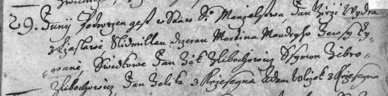 Dobrý den. V příloze posílám zápis o sňatku z roku 1660 mého prapra...předka Jana Jiřího Vydry. Nepodařilo se mi přečíst jméno obce, odkud pochází - viz. ??????. Přečetl jsem následující : 29.června potvrzeno jest xxxxxxxxx manželství Jan Jiří Vydra z ?????? s Ludmilou, dcerou Martina Moudrého xxxxxxxxx Evaně, svědkové Jan xxxxx z Libochovic, Šimon xxxxxx z Libochovic, Jan xxxxx z xxxxx, Adam xxxxxxxxx). V SOA to odhadují jako " z Čáslaviˇ", v čáslavské matrice jsem však v daném období žádnou zmínku o jménu Vydra nenašel. Pokud by se to podařilo přečíst, mohl bych pokračovat v pátrání. Děkuji předem.
