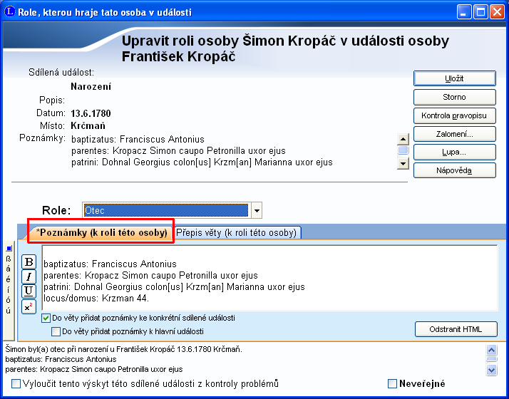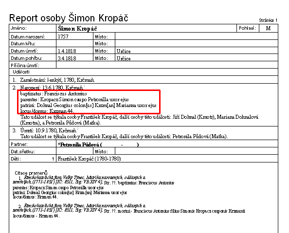Chtěl bych poprosit o radu zkušenější uživatele programu Legacy. Snažím se udělat si report o životě svého předka, Šimona Kropáče, ve kterém bych měl přehledně podchyceny všechny záznamy, které se mi o něm podařilo najít. Např. narodil se mu syn František. U tohoto Františka tedy k jeho narození přidám citaci pramene, která obsahuje text přepsaný z příslušného záznamu v matrice. Událost narození sdílím pro oba rodiče (a kmotry, kteří nejsou součástí rodokmenu), takže se mi objeví i v seznamu událostí vytvářeném pro Šimona Kropáče. Mám i nastaveno, aby byl text citace pramene zařazen do reportu. Výsledek uvádím níže, jedná se o druhou událost a přepis záznamu v matrice je připojen k citaci pramene. Rád bych to však měl tak, že text záznamu bude přímo v části s událostmi, nad nebo pod seznamem osob, s nimiž je událost sdílena, ne až dole u citace pramene. Bohužel, nepřišel jsem na možnost, jak to udělat. Jde to vůbec?