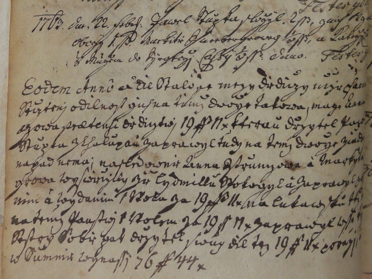 Téhož roku a dne stalo se mezi dědici _____ sečteny _____ jich na témž dvoře takova, maji Anna Štruncová?? ____ dědictvi, 19 ____ 11?? kterou držitel Pavel Stupka s chalupou zapravil tady na tom dvoře žiadn??___ nema, nasledovně Anna Štruncova a Markyta Šnepergrova??? vysvěčily že Lidmilu spokojil a zapravil ____ nim a vydanim 1 vola za 19___ 11?? na Lukavsku ____ na temž panstvi 1 volem za 19___11 zapravil vše _____ sestry sobě pak držitel svůj dil tež 19___ 11 považi___ v sumě vynaši 76___ 44. "