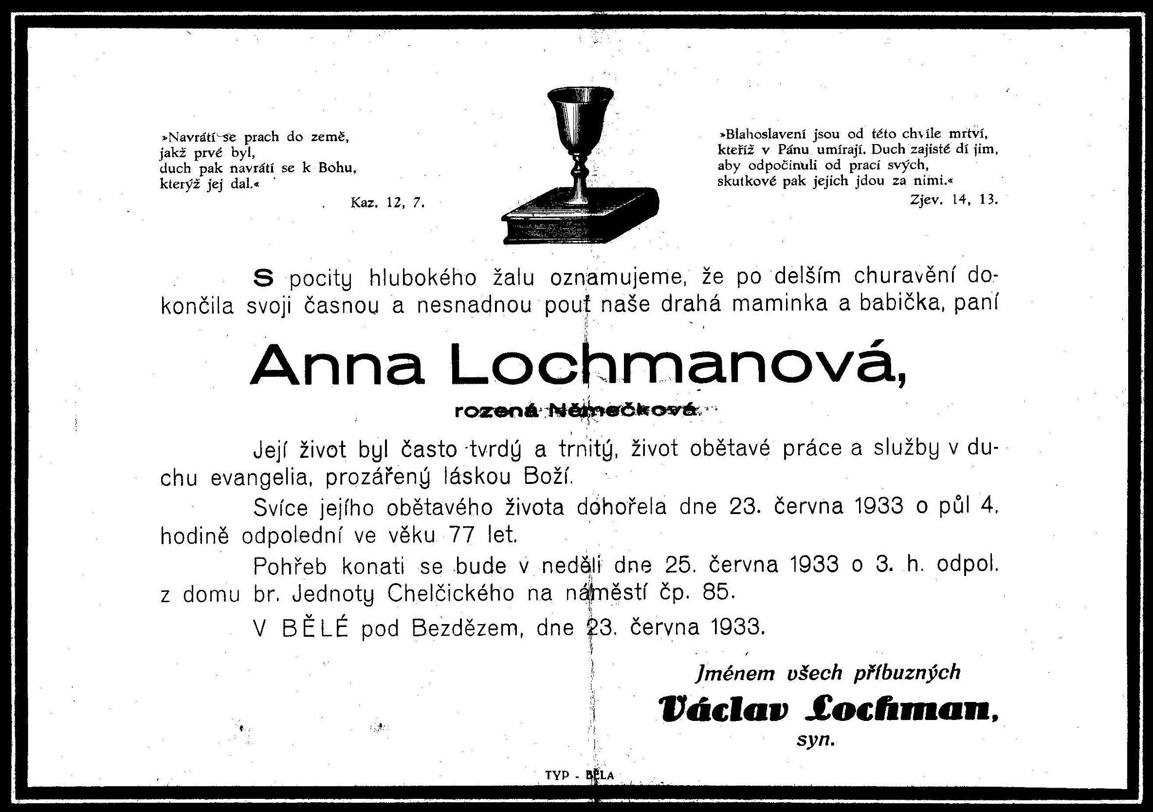 V katolických matrikách jsou indexy, tam jsem na nic nenarazila, výskyt příjmení Lochman ano, Anna Lochmanová, roz. Němečková, se jako matka nikde neobjevuje, ani jsem nenašla předpokládané narození syna Václava Lochmana, který je podepsán na parte.