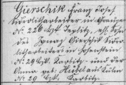 Otec Franze Josefa se jmenuje Ignác Girschik, si myslím, ale nemohu rozluštit jeho zaměstnání a kde bydlí. Okres je Karbitz, tzn. Chabařovice, jeho syn je z Krupky, tudíž předpokládám, že to bude někde z okolí.