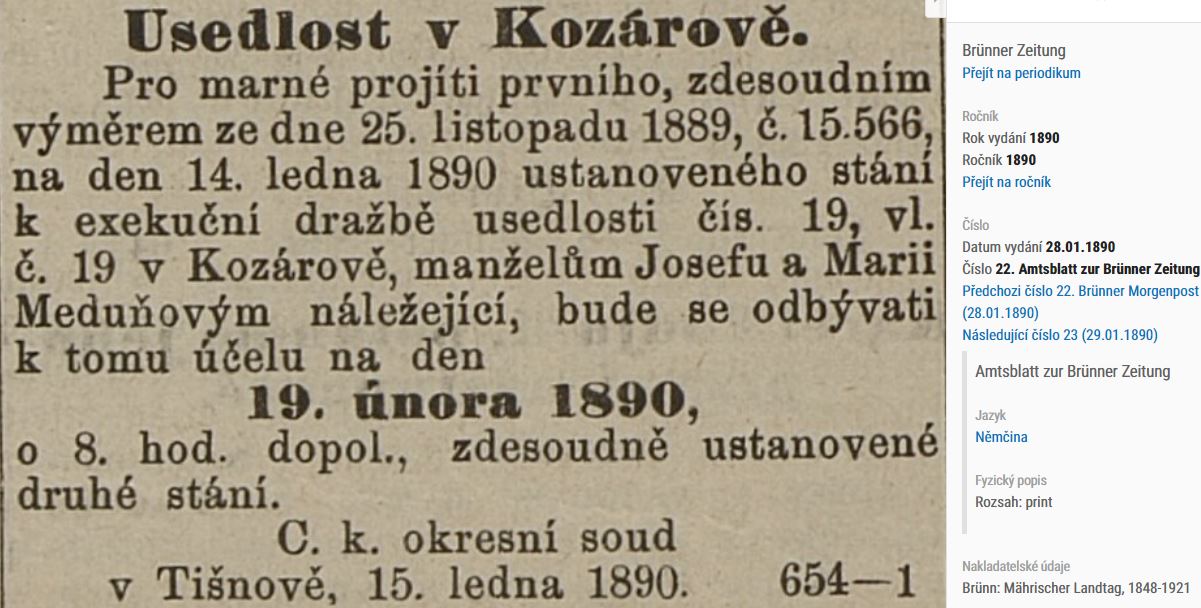 V únoru 1890 byla usedlost čp. 19 exekučně vydražena a v březnu nabízena na prodej.