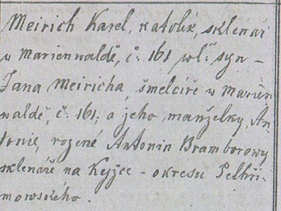 v předposledních řádcích příloh - zápisů je uveden název na "Kyžce" ,pravděpodobně sklářské huti,.Přkládám 3 zápisy ,v každem je název huti trochu jinak ....Žádnou takovou huť nemohu najít,neporadil by mi někdo o kterou huť na Pelhřimovsku by se mohlo jednat? Hledám předky se jménem Mairich a Brambora,oba později pracovali v huti Marienwald(Posekanec),ale odkud tam přišli,či kam odešli zatím