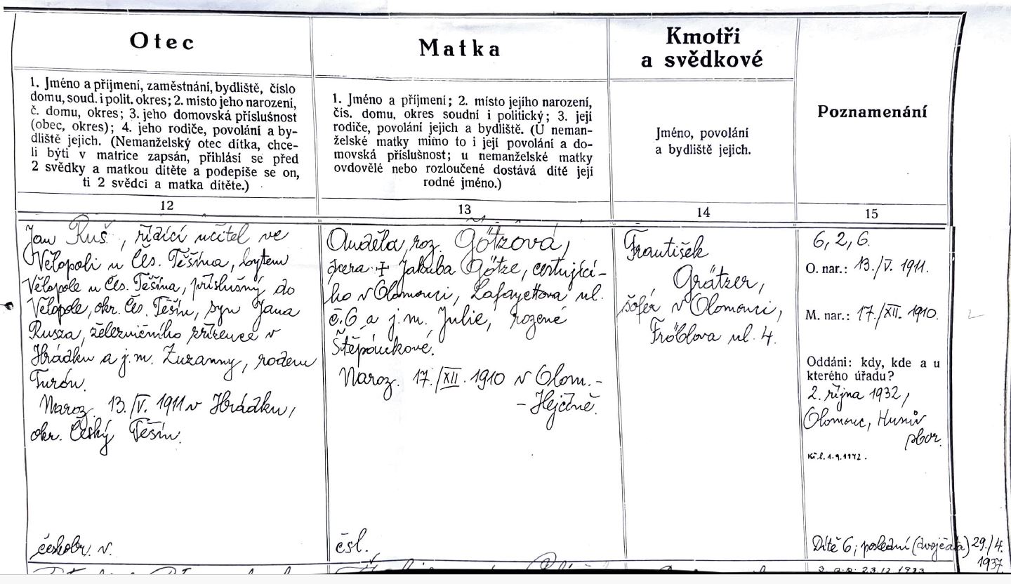 Hledám záznam o narození mého pradědečka, Jana Ruše, který se narodil 13. května 1911 v Hrádku (okr. Český Těšín). Tato informace byla získaná z knihy narození jeho syna (viz přiložený obrázek). Bohužel se nemohu dopátrat konkrétního záznamu o jeho narození a ani záznamu o sňatku - 2. října 1932 s Andělou Götzovou - oddáni v Olomouci, Husuv sbor (viz vpravo dole). Hledal jsem kde se dalo. Matrikářka v Bystřici (kam spadá Hrádek) nic nenašlia. Napadlo mě, zda to nesouvisí právě s tou Církví husitskou.