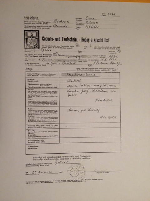 Mám rodný list vystavený v roce 1940 (viz příloha). Podle něho se 1. 5. 1820 narodila ve Spešově č. 27 Marie Kupková, pokřtěna byla téhož dne v Bořitově. Rodiče Josef Kupka, půlláník ze Spešova a Marie Kupková, roz. Stránská.
