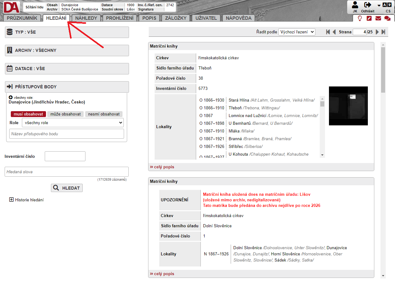 Bohužel, na toto jaksi přímý link poslat nejde. Takže nakoukněte spíš do přílohy. Klikněte na záložku "Hledání" v liště nahoře. Je tam k dispozici výběr pramenů (matriky, kroniky...), vyhledávání dle datace apod.
