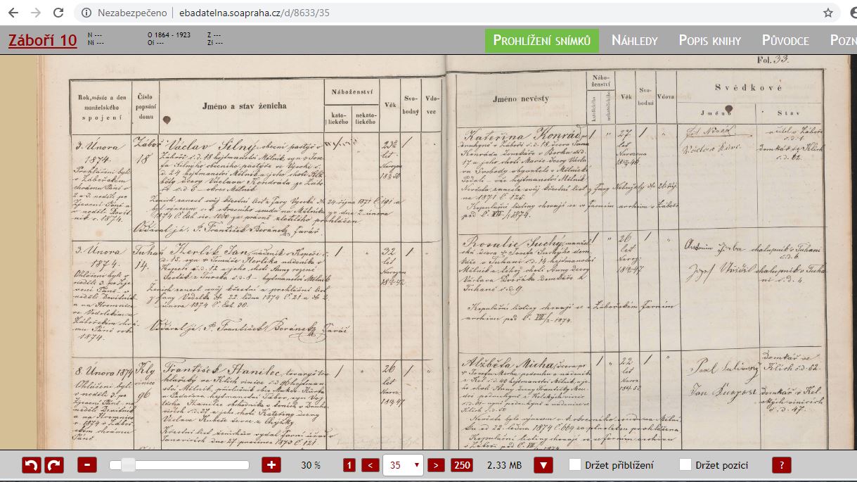 Jedná se o dva záznamy sňatků 1874 + 1899 z matriky Záboří 10 (http://ebadatelna.soapraha.cz/pages/Mat ... aId/8633?7).