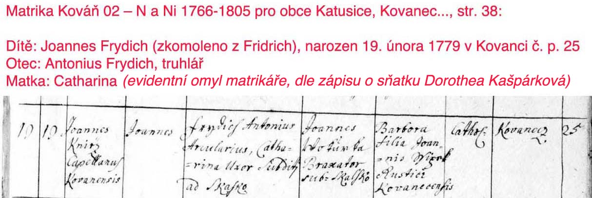 Aha, díky moc za nálezy i tipy, ten posledně uvedený index MB jsem ještě asi vůbec neprocházel a třeba v něm budou i nějací Pecháčkové nebo Friedrichové. A stejně mě tohle všechno čeká až později, jestli vůbec, teď mi šlo o to, najít ZARUČENĚ PRAVOU Annu Veselou, protože ta byla poslední ze 7. generace, která mi chyběla svým VLASTNÍM zápisem o narození vůbec. A to jsem myslím s vaší pomocí už zvládnul, už ani ta případně nalezená svatba Wesseli/Pawlowa by nemohla ohledně Anny nic víc potvrdit ani cokoli vyvrátit. I když je mi pořád divné, že na svatbě s Janem Fridrichem byla tak strašně rozrušena, že se sekla o ŠEST let. Ale třeba se sekl spíš pan farář...