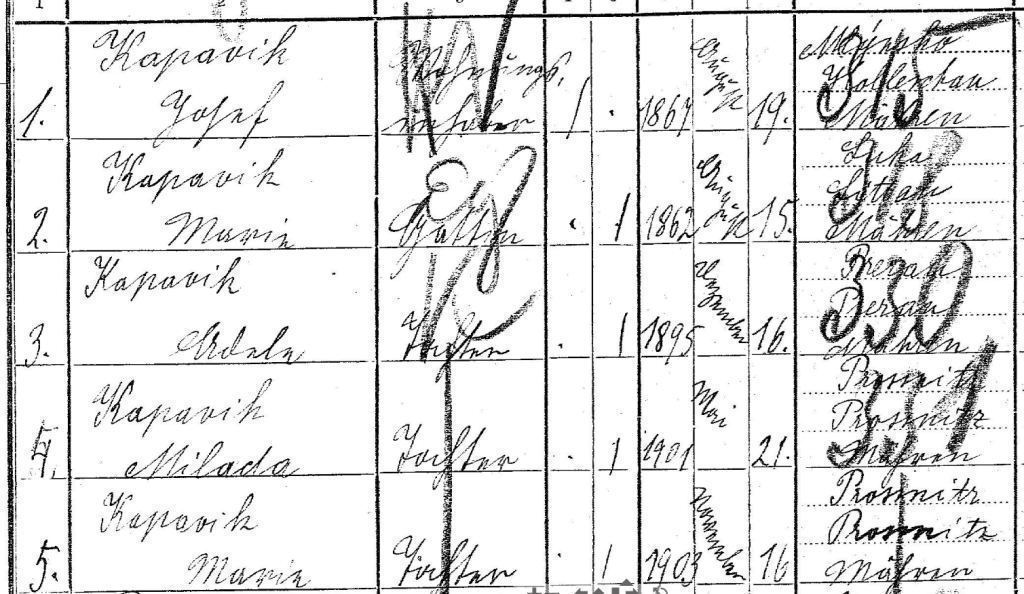 Dobrý den, řeším následující záhadu. Můj předek měl 3 dcery. 1. dcera se narodila roku 1895 v Přerově. Narození zbývajících dvou - Marie a Milady - bohužel nemohu nalézt. Ve sčítacím operátu z Ostravy (kde léta žili) jsem nalezl záznam (viz příloha), kde je rovněž uvedeno místo narození Marie i Milady. Domníval jsem se, že se jedná o obec Prosenice (dokonce sousedí s Přerovem). Ve zdejší matrice narození jsem nenalezl narození ani jedné dcery. Má někdo nějaký nápad? Možná jsem si jen špatně vyložil to německy psané město narození ? Děkuji moc za případné tipy.