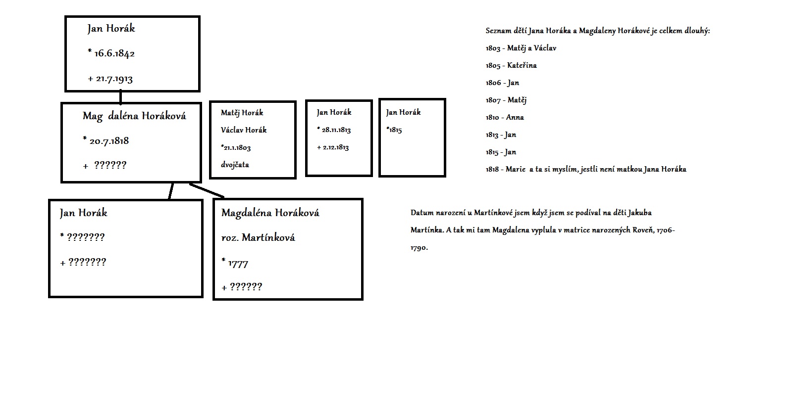 ASI u Horáků to bylo tak, že Vavřinec měl syna Jana Horáka (1772), který měl mimo jiné i syna Matěje (1807 - bratr Mariány), ale ten není v přímé linii. Jinak mi jména u Horáků nic zatím (!) neříkají. Nezlobte se.