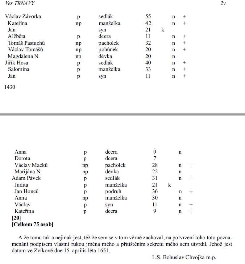 Další pamen, ze kterého se dá čerpat je soupis obyvatel dle víry z roku 1651. Tam se ovšem ve vsi Trnava takové jméno nenachází, viz screen v příloze.