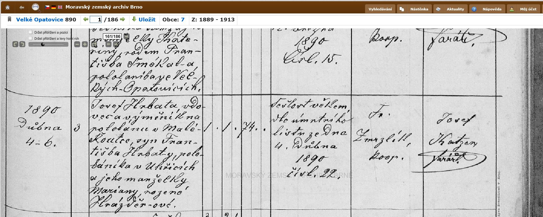 dále pak Franz Hrbaty, Halblähner in Ungerndorf, ehelicher Sohn des Franz Hrbaty, Ausgedingler, und der Marina, gebornen Hrazdie?rin, Halblähners Tochter von Ungerndorf, beyde Katolische Religion.