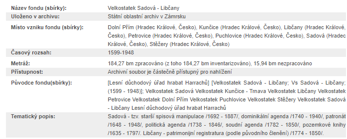 ZAHRÁDKA F.: VELKOSTATEK SADOVÁ - LIBČANY 1696-1886. Inventář, 1963, s. 150, ev.č. 404.