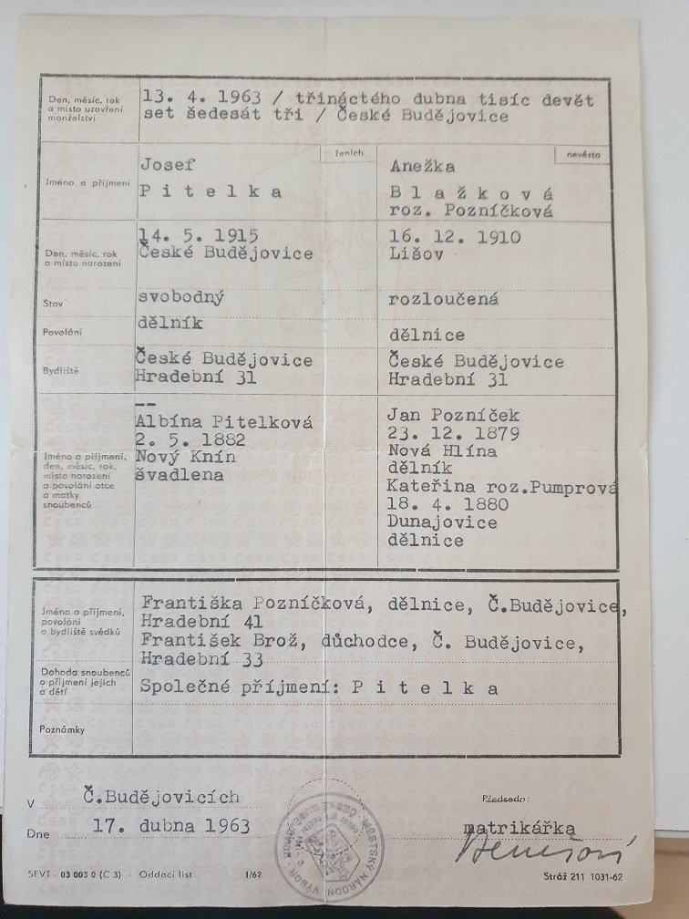 Zora píše:Jaké příjmení má hledaná Kateřina na oddacím listě své dcery - jinak řečeno, za koho se provdala? Zcela jistě tam bude uveden i otec nevěsty - pokud tedy nebyla nevěsta nemanželská.-