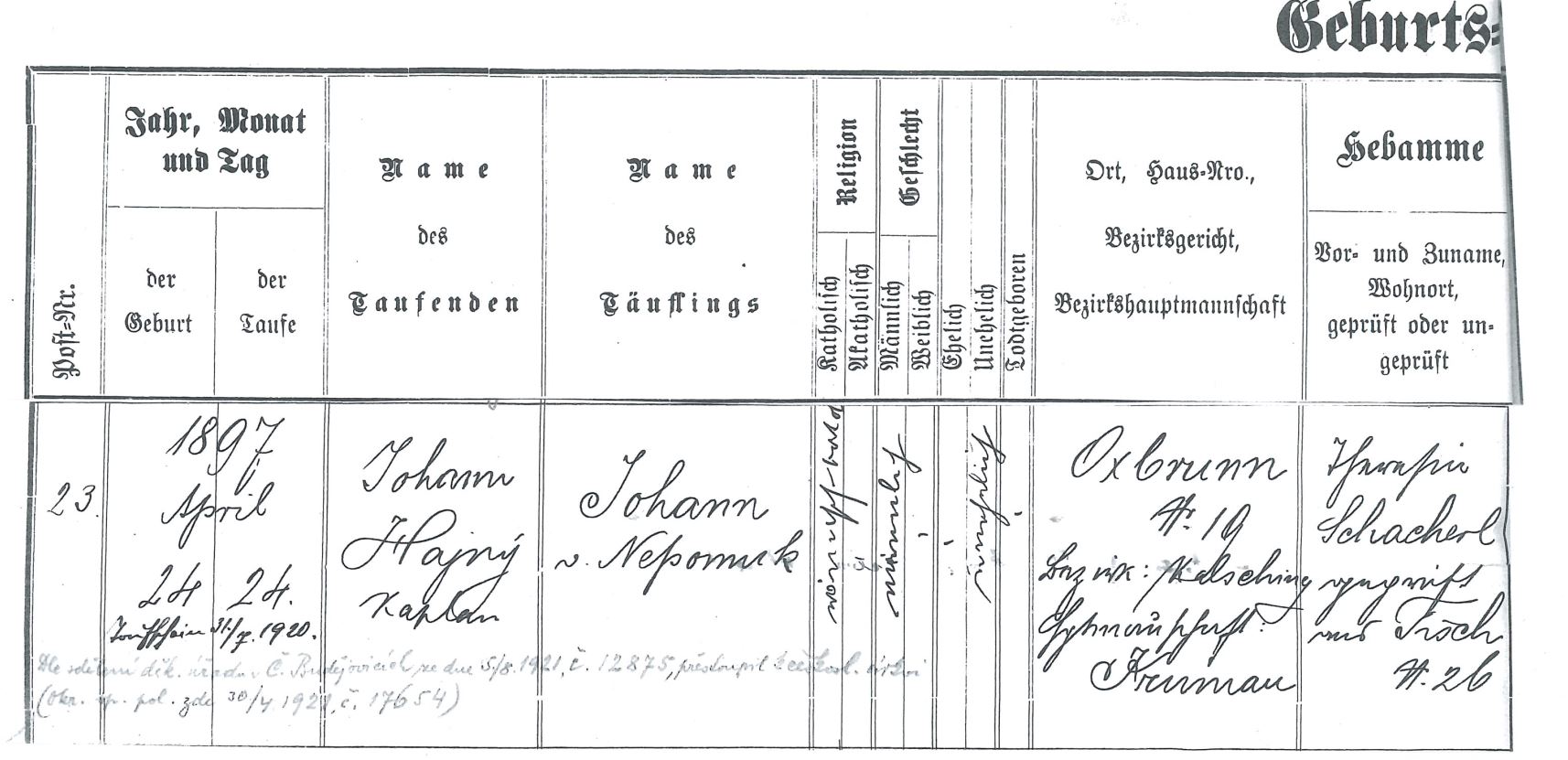 Při trpělivém kontaktování různých vzdálených příbuzných v průběhu let se jeden z nich vytasil s rozhodnutím z roku 1856 (doslova Decret od c.k. okresního soudu), které ukládalo faktickému otci "náhradu útrat posavádního živení" - alimenty. Prostě velmi šťastná náhoda.