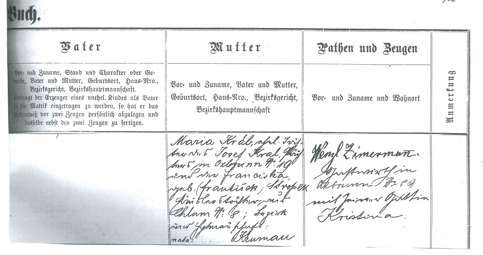 Ještě mě napadlo najít sčítací lístky pro svobodnou matku Královou, zda se tam nevyskytuje nějaká informace... Jak kolem narození syna, tak i v pozdější době, zda spolu třeba nežili, nebo se nějak nemohli znát... Spíš nad tím ale přemýšlím jen proto, že jsou to dostupné doklady....