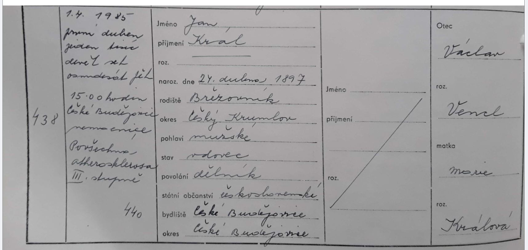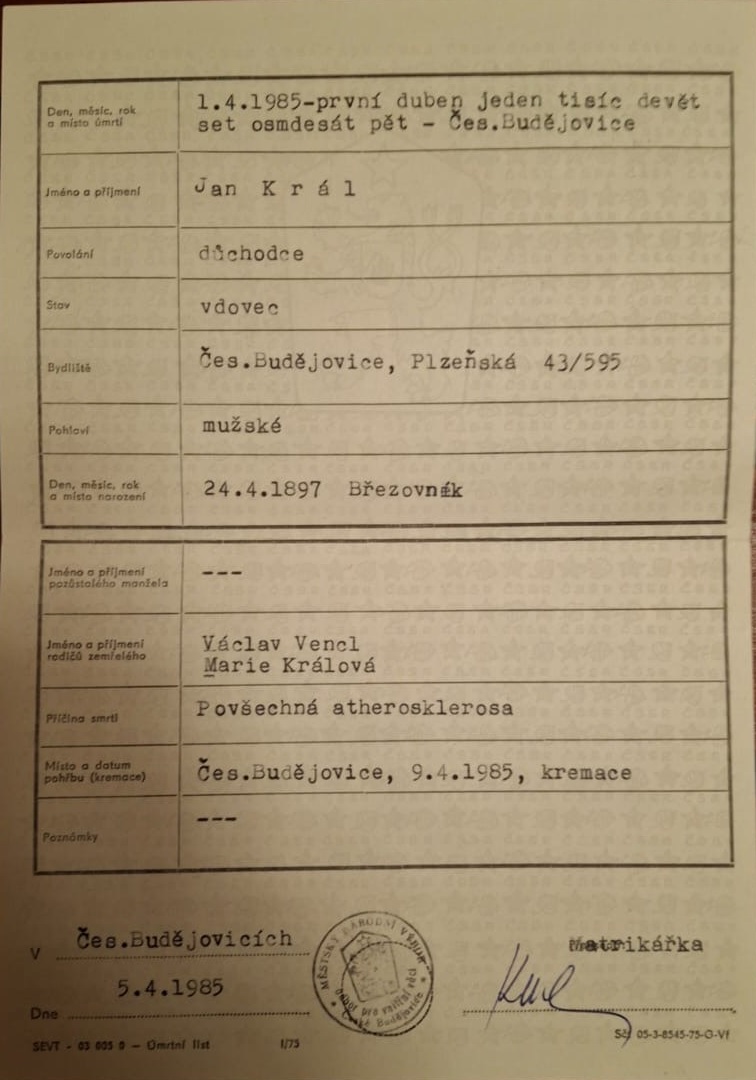 Úmrtí: 01.04.1985, Plzeňská 43/595, České Budějovice