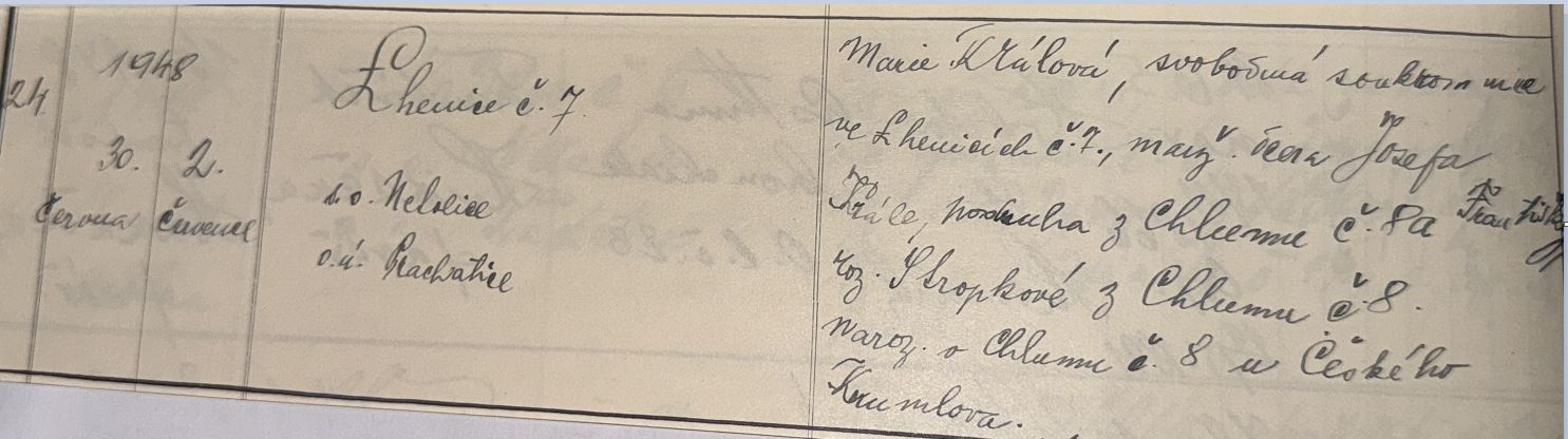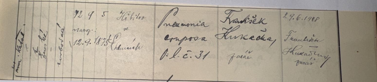 Dále zde mám matriční záznam o úmrtí Marie Králové (matky Jana Krále).