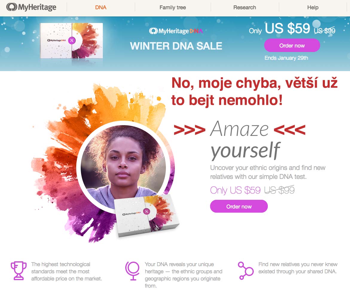 To, že nejste ohromen je logické když už jste nějaký test podstoupil. I když, jak jsem pochopil, tak pouze jednoduchý test Y-DNA, který s tímto nemá moc společného. Ta reklama je cílena na lidi, kteří to nikdy nedělali a hlavně na američany, kteří nemají leckdy o svých předcích žádnou představu.Ladislav Bátora píše:Navíc jsem netušil, že ten etnický mix MH vypočítává z (domnělých) rodišť předků. To bych možná zvládnul sám.