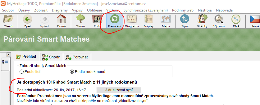 chtěl bych se optat na problém s párováním. Od prosince 2018 jsem si zaplatil plné členství. Když si v MyHeritage kliknu na párování tak se mi zobrazí počet dostupných shod, ale s informací o poslední aktualizaci k 11/2017.
