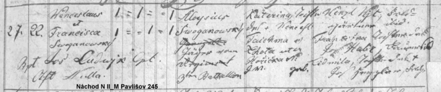zcela neočekávaně jsem zachytil přítomnost části asi mého rodu na Náchodsku (Pavlišov, Hronov, Staré Město...), a sice počínaje svatbou Aloise Svojanovského v Pavlišově 1823. Jestli dobře čtu, měl by být příslušníkem 3. batalionu polních myslivců, narozen 1793 jako syn Aloise z Labského Kostelce (Kostelec nad Labem ) viz přílohy. Rod mi mizí někde kolem roku 1900, pokud vím, dodnes žijí Svojanovští v Jičíně. Nenarazil jste někdo při bádání na tohle příjmení? Nevíte, kde a jak získat informace o 3. batalionu polních myslivců v tomto regionu? Nevíte, jestli by nemohl být archiv ohlášek v archivu zámku Náchod, a kde ho hledat?