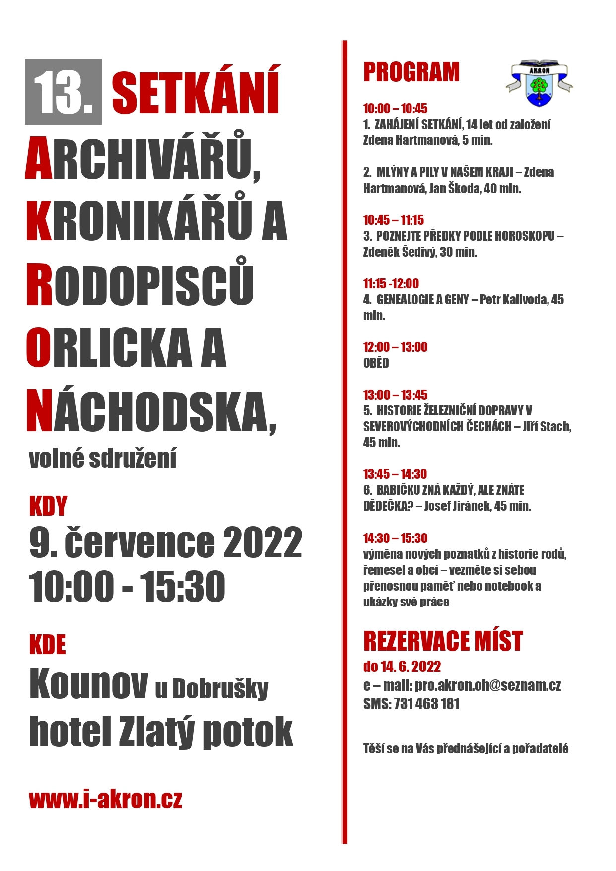 Pozvání na 13. setkání archivářů, kronikářů a rodopisců orlicka a náchodska - volné sdružení AKRON
