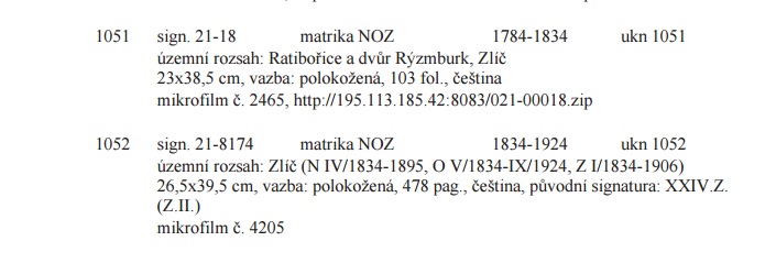 Matrika Ratibořice je do roku 1834 za Zlič, Ratibořice a Rýzmburk