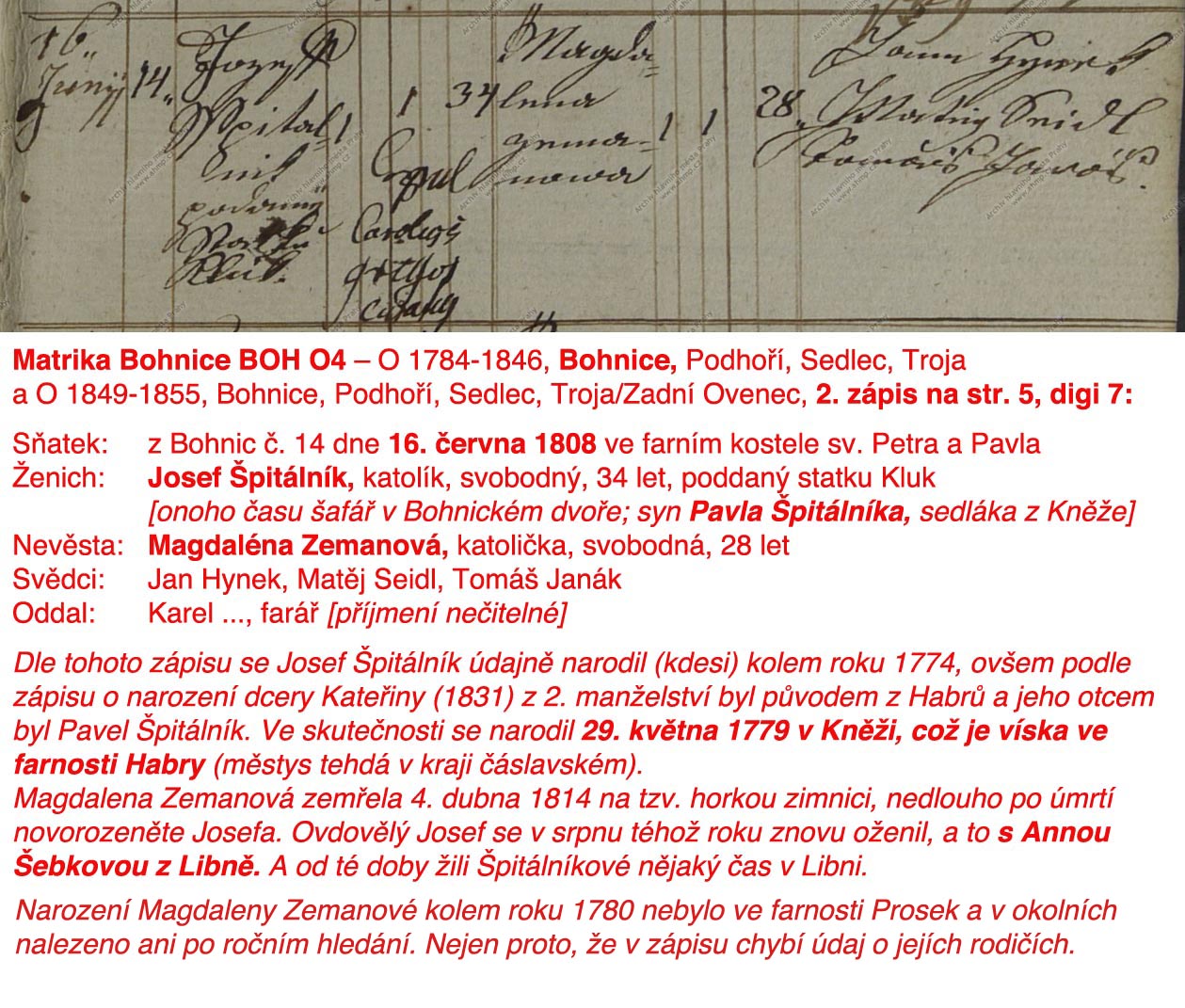 Hledám – už rok marně – narození Magdaleny Zemanové, někdy kolem roku 1780, snad v nějaké vesničce u Prahy. Vzal si ji v roce 1808 za ženu (viz přílohu) můj prapraprapradědeček Josef Špitálník, rodem z Habrů v kraji tehdy čáslavském, tou dobou ale už šafář v Bohnickém dvoře. Už i v těch Habrech jsem ji hledal, když mě napadlo, že si ji třeba přivezl z dovolené v rodném kraji...