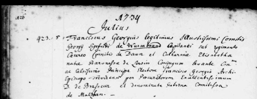 Těžko by mohl být vyslancem a zároveň sloužit u 10. pěšího pluku s posádkou v Písku. Vyslanec z Neapole by si taky asi těžko vzdal jihočeskou rytířskou dcerku, naopak pan kapitán to z Písku neměl na Veselíčko tak daleko. Franz Georg je určitě jiná osoba než Franz Joseph Georg, ale netuším, kdo jsou jeho rodiče. Potřebovala bych vidět ten matriční záznam z Frankfurtu, pokud existuje. Moc prosím, jak jsou na tom matriky z Frankfurtu nad Mohanem? Online asi ne? Pokud ne, mám tam napsat - a na faru, do archivu nebo kam?