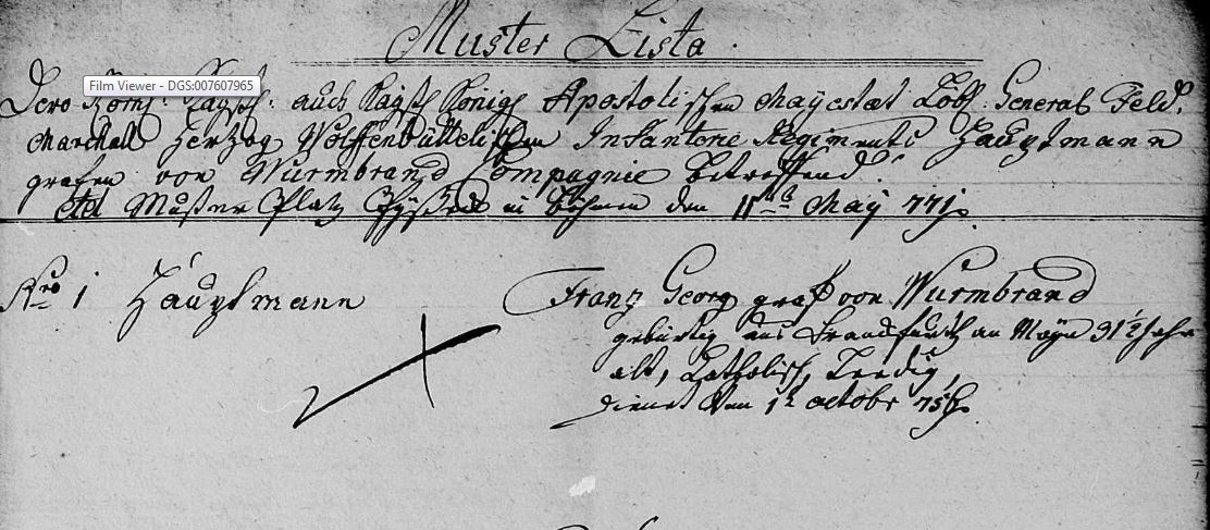 Jednalo se o 10. pěší pluk, má sepsané dějiny a z nich vyplývá, že Franz Georg u něj byl 1757-1773, od fenricha přes podporučíka a nadporučíka po kapitána