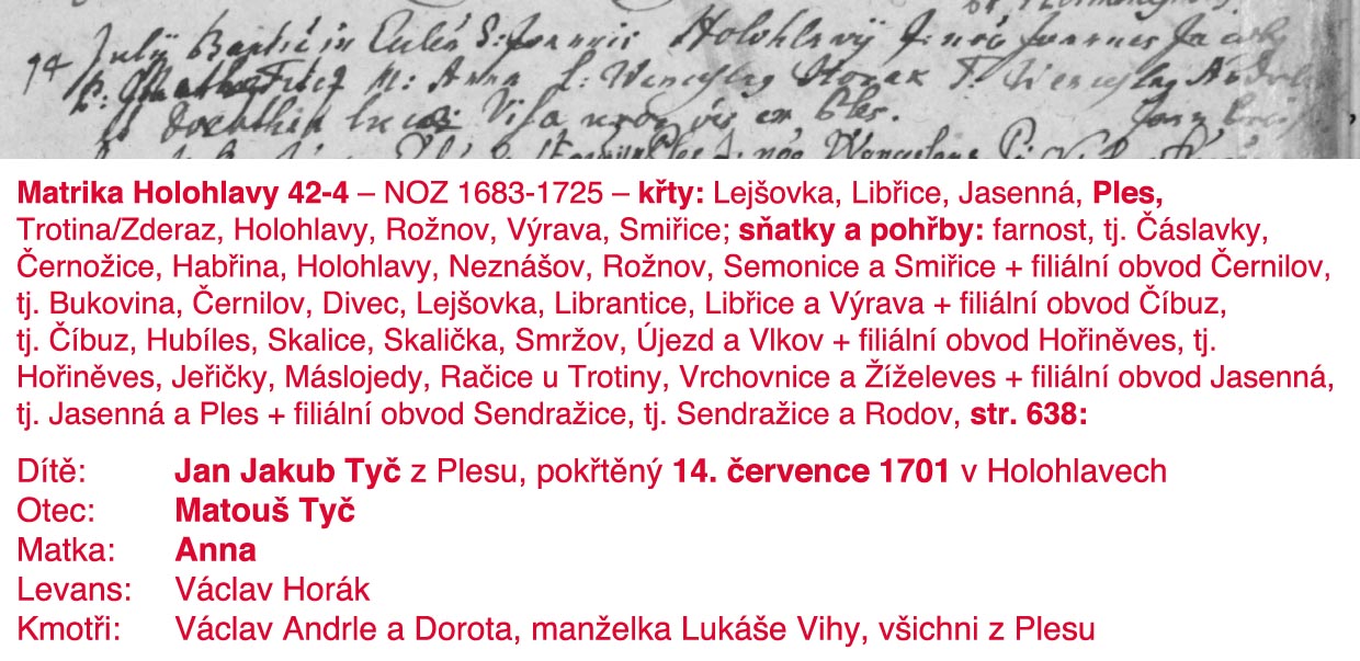 Nemáte prosím pěkně někdo v portfoliu předků rod Tyčů – psáno promiscue Titcz, tycz a podobně) – z vesnice Ples, co stál na místě dnešního Josefova? V matrikách Zámrsk je to pod Starý Ples.