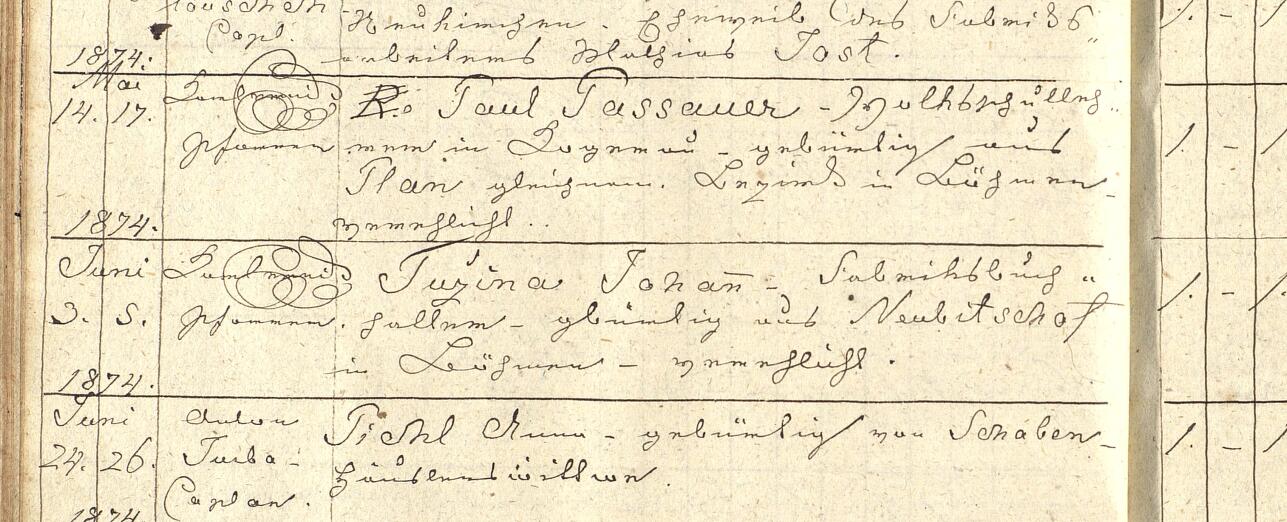 1. Hledám místo narození Františka Tužiny, který se narodil asi v letech 1813 - 1814 pravděpodobně někde v Praze. Zatím se mi podařilo najít, že František se v Praze dne 8.1.1843 oženil s Aloisií Watzke viz. : http://katalog.ahmp.cz/pragapublica/permalink?xid=FB4B9DEA542447B3B90179BFA8FCD5BD&scan=179#scan179 a to mu bylo 29 let. Z toho jsem odvodil kdy se asi narodil. Byl panským myslivcem Karla von Thurn - Taxis v Hejkovicích a Patříně ( u Loučně), v Dolánkách ( u Mladé Boleslavi) a nakonec správcem revíru Thurn - Taxisů v Liberci. Kdy a kde zemřel se mi zatím nepodařilo najít. Našel jsem pouze že v Liberci roku 1877 zemřela jeho manželka Aloisie.