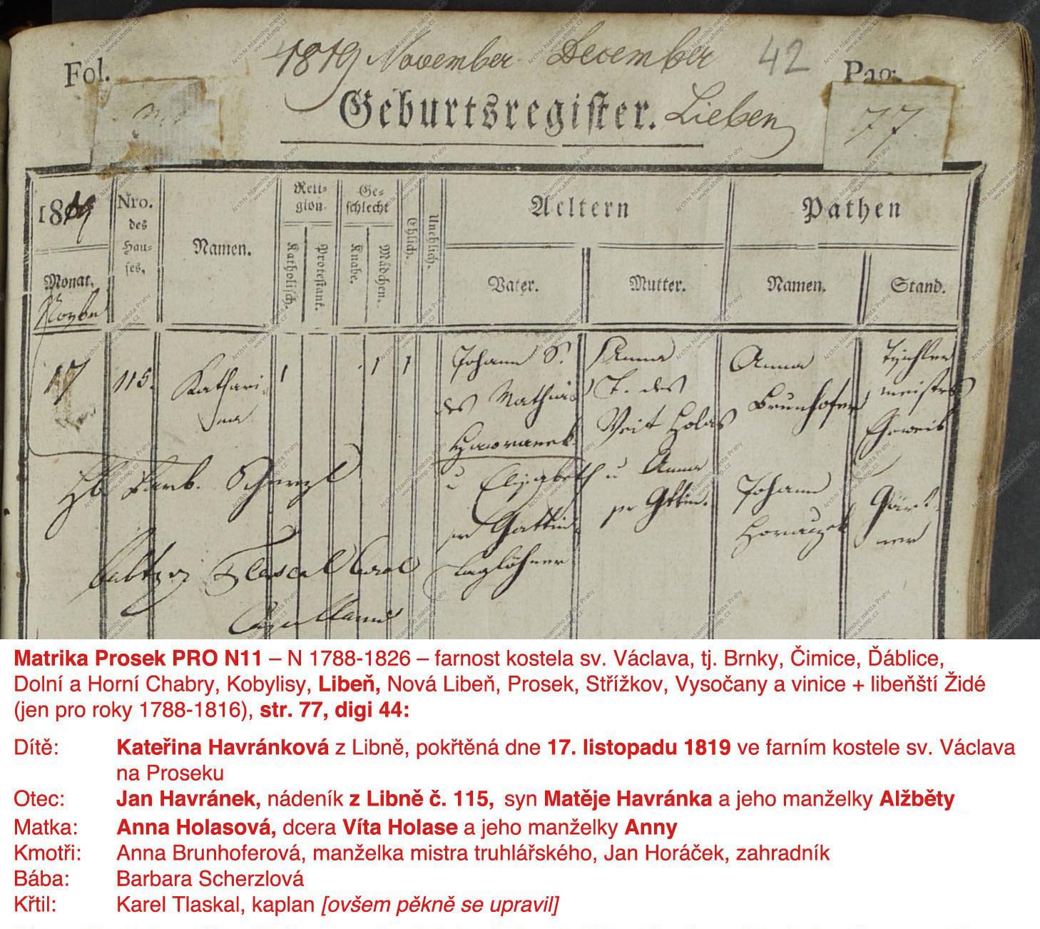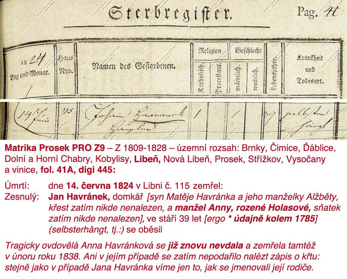 P.S.: Jan Havránek byl v roce 1830 už mrtvej. Ale podívám se do těch Soupisů, zda tam přece jen není Anna Havránková, když byla potom paní domu, s těma dvěma dcerkama na krku (už se znovu nevdala a umřela v roce 1838, 14 let po té manželově tragické smrti). Ale pochybuju, jistě jsem to už dávno zkoušel. Měl bych si zavést notýsek „Havránek/Holasová“, kde jsem všude už bádal, abych všechno neprolejzal každý dva roky znova...